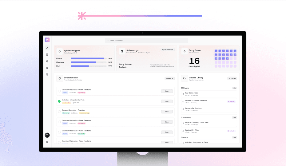 The product is designed to minimize context switching and support focused, exam-driven learning, helping students stay in a flow state during revision.